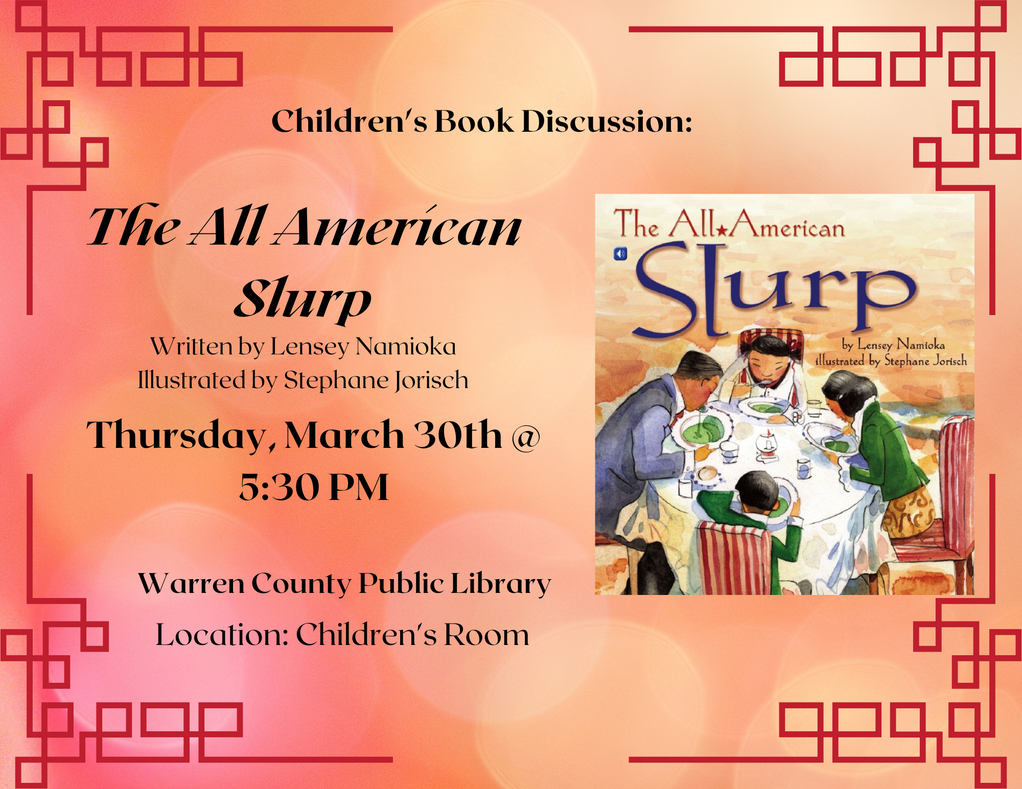 While the adults enjoy their book discussion about The Family Chao by Lan Samantha Chang, children are welcome to gather in the children’s room for a special story time. We’ll be reading The All American Slurp by Lensey Namioka.
