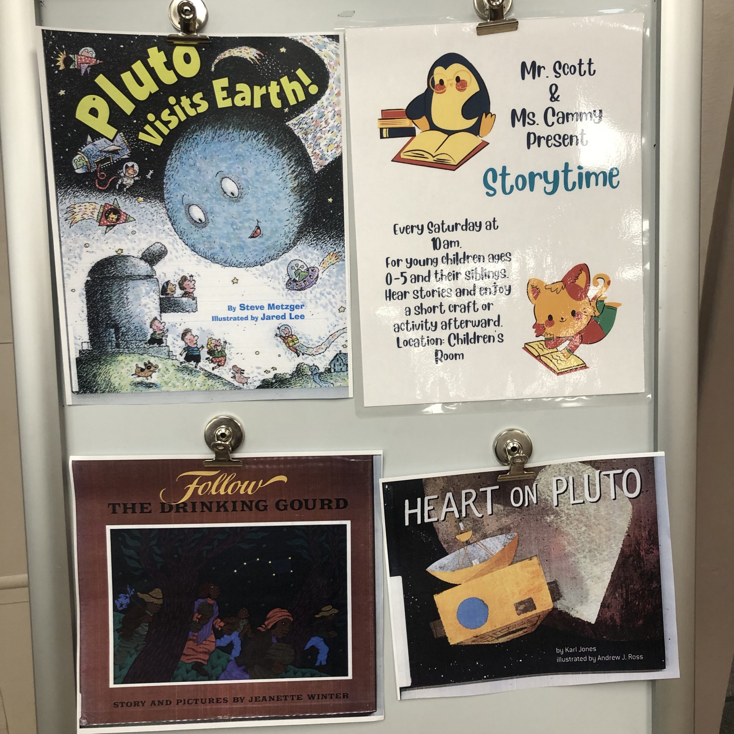 Join us for Storytime Saturday, February 18th in the Children’s Room at 10 AM. Miss Cammy will be reading Follow the Drinking Gourd by Jeanette Winter in honor of Black History Month, Pluto Visits Earth by Steve Metzger to celebrate Pluto Day, and Heart on Pluto by Karl Jones to celebrate Pluto Day and Valentine’s Day.