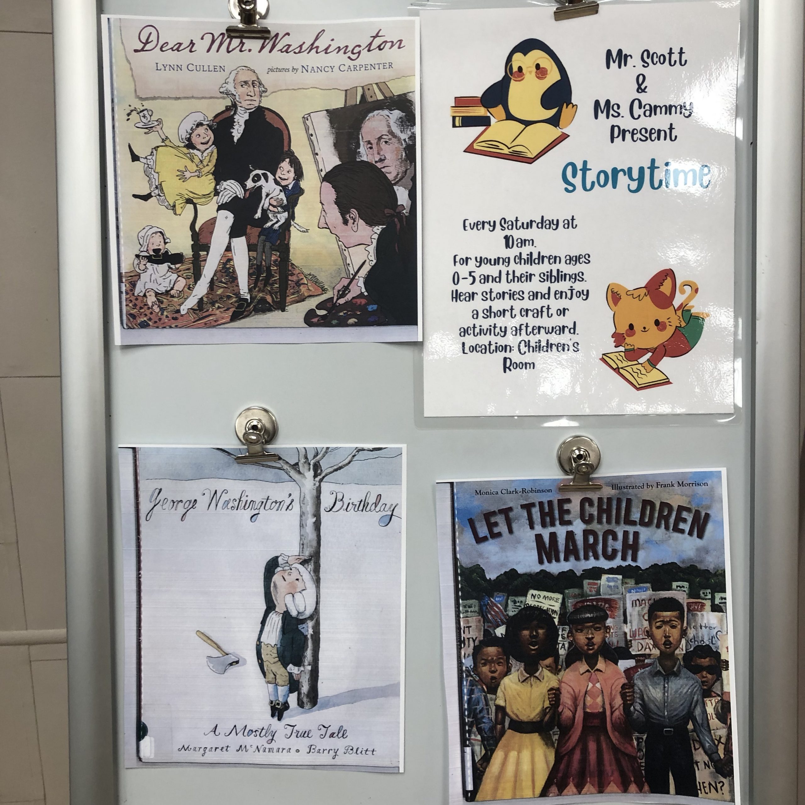 Join us for Storytime on Saturday, February 25th in the Children’s Room at 10 AM. Miss Cammy will be reading Dear Mr. Washington by Lynn Cullen and George Washington’s Birthday A Mostly True Tale by Margaret McNamara to celebrate George Washington’s Birthday, and Let the Children March by Monica Clark-Robinson in honor of Black History Month.