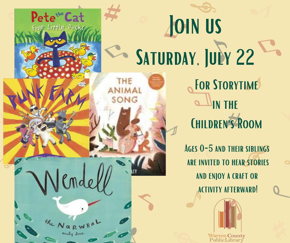 Join us on Saturday July 22 at 10:00am in the Children’s Room for Storytime! We will read books about music and singing, play our own instruments, play freeze dance and make a musical craft! We can’t wait to see you!
