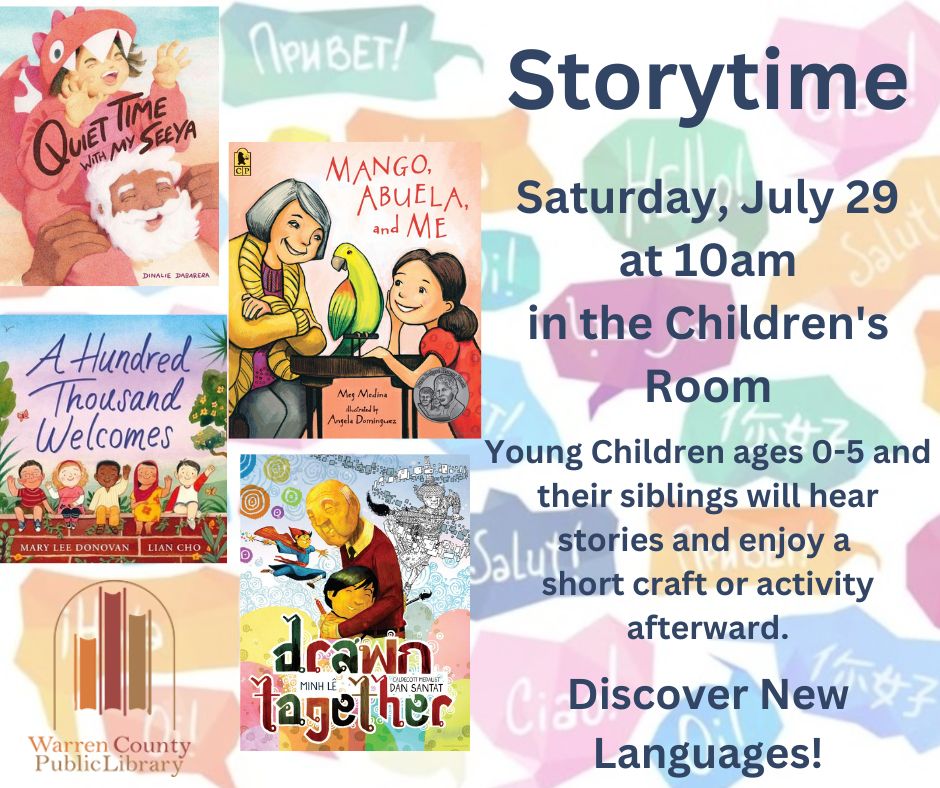 Join us for Storytime on Saturday, July 29 at 10:00am in the Children’s Room. We will be reading about different languages, how different languages come from all over the world and more! Don’t miss out! See you there!