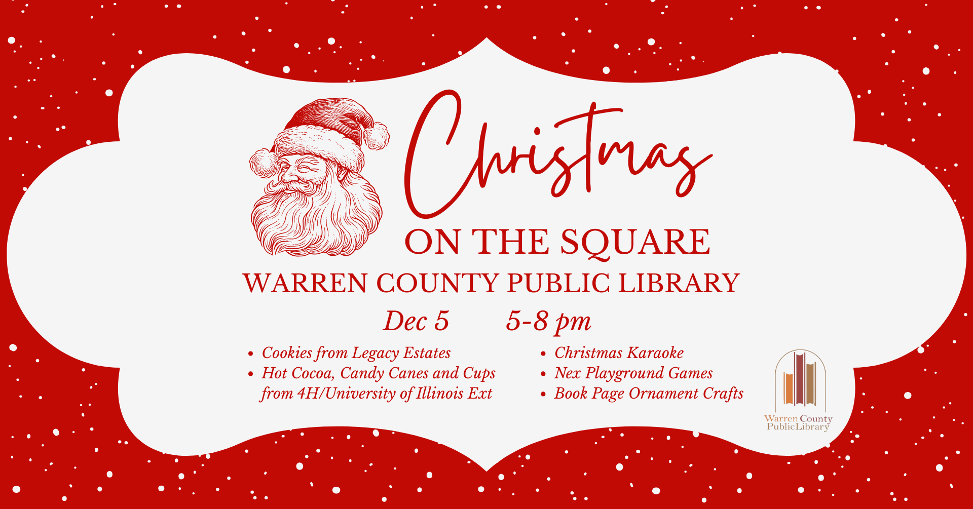 Join us during Christmas on the Square for several great family activities! Fri, December 5 @ 5-8pm! *Christmas Cookies from Legacy Estates* Hot Cocoa Packets, Candy Canes and Cups from 4H/U of I Extension*Book Page Ornament Craft*Christmas Karaoke*Nex Playground Games |