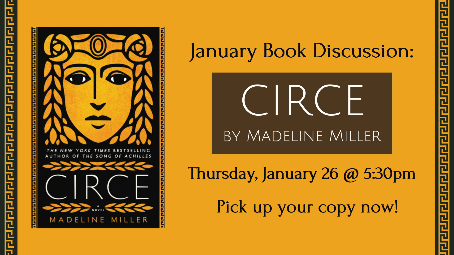 Join us Thursday, January 26th @ 5:30pm at the library to discuss the novel that inspired a boom in retellings and reimaginings of mythology from the perspective of the women, Circe by Madeline Miller. Books are available for pick up now to allow for extended reading time due to the holidays. While supplies last!