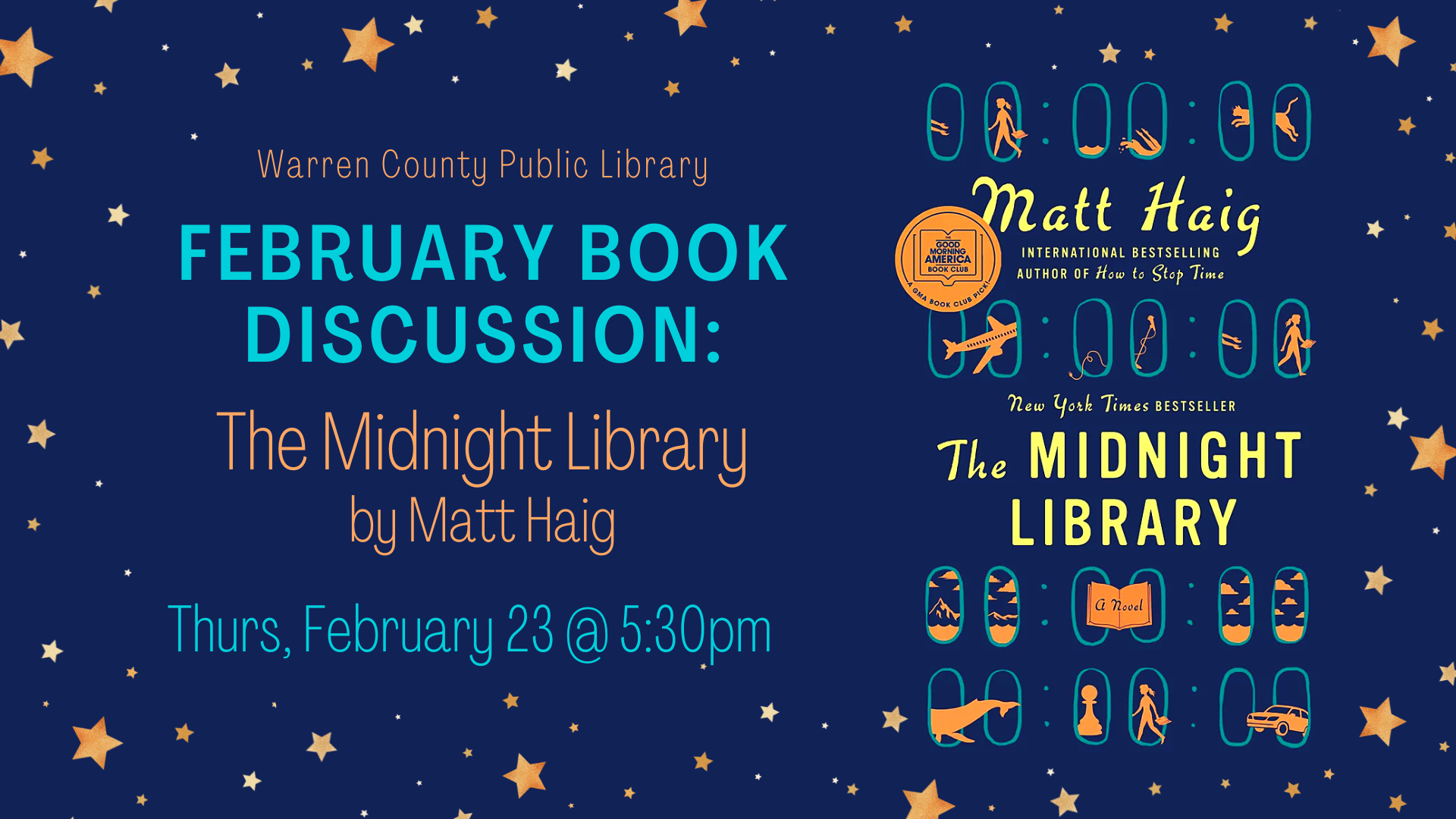 Join us Thursday, February 23rd @ 5:30pm to discuss the popular novel, The Midnight Library by Matt Haig. Books available for pick up now! While supplies last